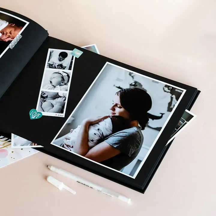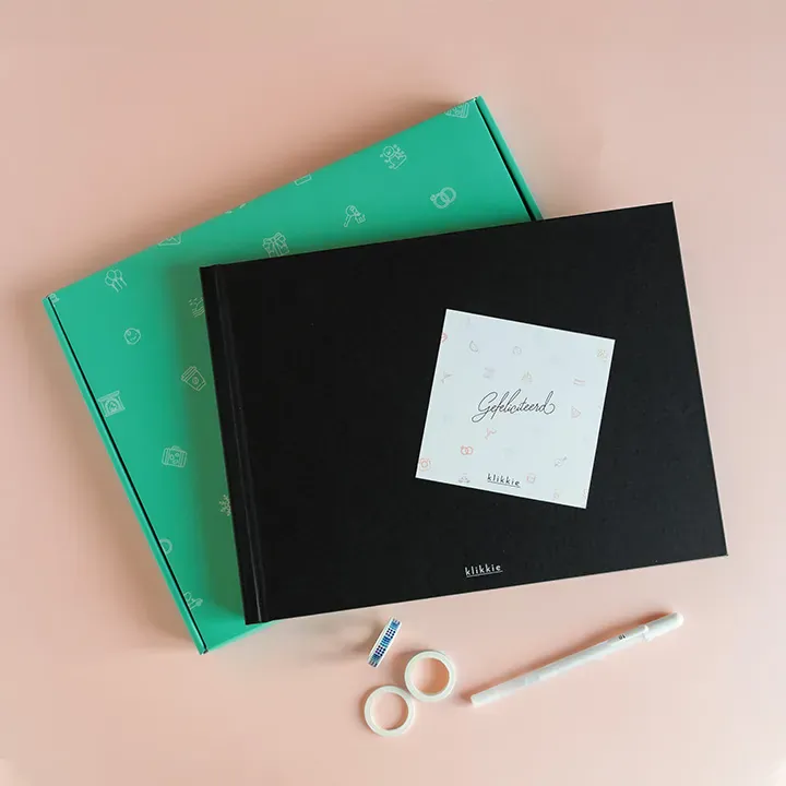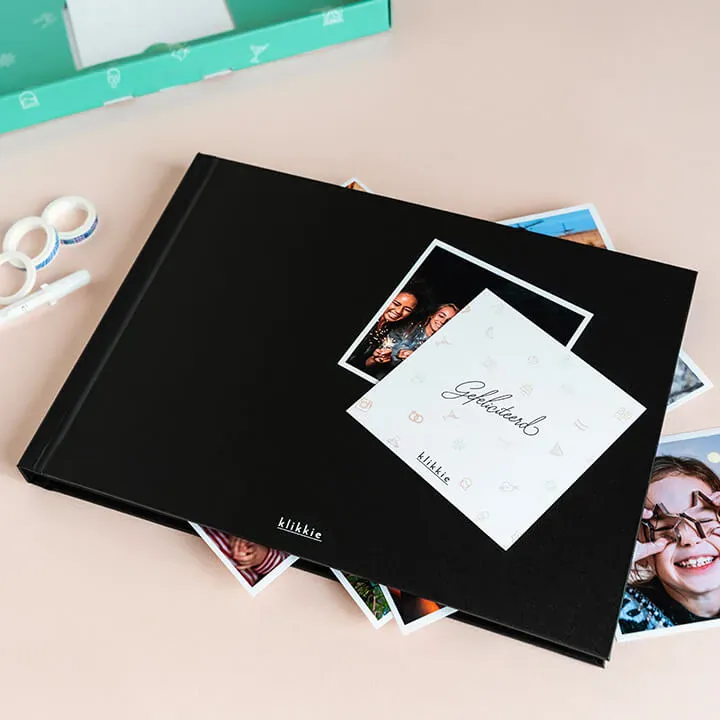 Plak elke maand de leukste foto's in het zwarte luxe album, schrijf leuke anekdotes met de witte pen en geniet.